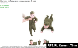 В эти майские дни розничные и интернет-магазины словно соревнуются в изобретательности. В продаже есть сувенирные кокошники, сделанные из кокард и георгиевских лент. Детские ползунки в виде гимнастерок и даже крабовые палочки. Такие сувениры, по словам продавцов, сопостовимы по популярности разве только с сувенирами с изображением Путина.