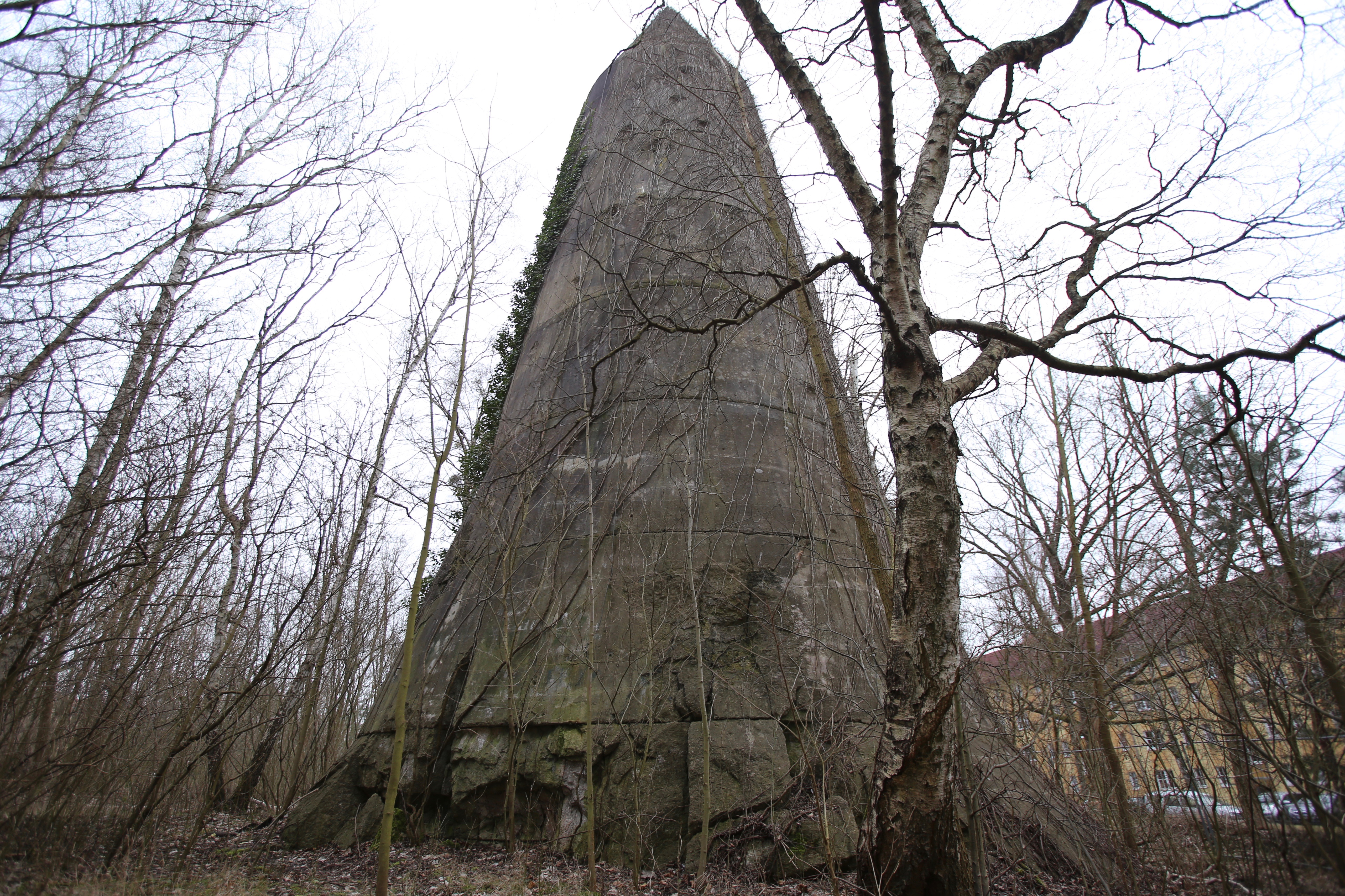 На территории Вюнсдорфа построили 19 наземных убежищ – так называемых башен Лео Винкеля. Этот изобретатель предположил, что для эффективной защиты от бомб надо не закапывать сооружения под землю, а наоборот, делать высокие конические конструкции с толстыми стенами. Башни высотой больше 20 метров имели незначительное заглубление (в тех, что стоят в Вюнсдорфе, отказались от единственного подземного этажа) и вмещали до 600 человек.