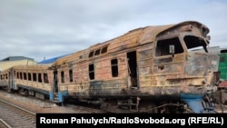 "Электричка сожжена частично, в вагонах выбиты окна, мусор. Скорее всего, сюда его сбрасывали российские военные, – показывают местные жители. – Видите – вот индивидуальные рационы российской армии, сожженные машины, "вазик". А вот гражданская техника, со знаком Z, скорее всего, отобранная у местных жителей".