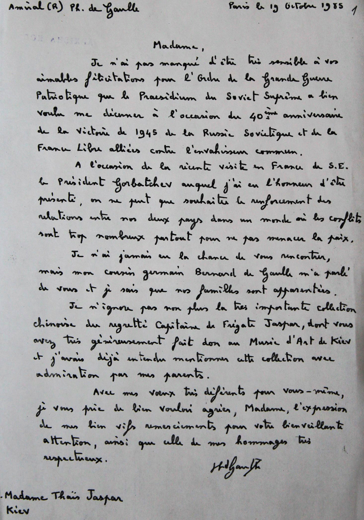В 1980-х, уже после смерти Шарля и Ивонны де Голль, Таис переписывалась с их сыном Филиппом, адмиралом французского военно-морского флота и будущим сенатором. Его письмо хранится в Архиве литературы и искусства. Филипп благодарит Таисию за поздравления (накануне его наградили советским орденом Отечественной войны), рассказывает о своей встрече с Михаилом Горбачевым и упоминает о родстве семей Жаспар и де Голль, а также о китайской коллекции.