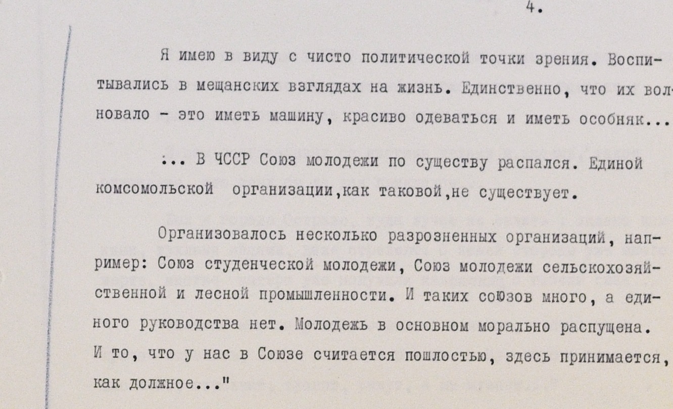 Антисоветские взгляды молодым людям навязывала чехословацкая интеллигенция, в том числе преподаватели, считали военные. В одном из писем есть такие строки: “В школах, институтах учителя и профессора преподают ученикам и студентам клеветнические нападки на Советский союз, на социализм, а эта лохматая молодежь им охотно верит”.