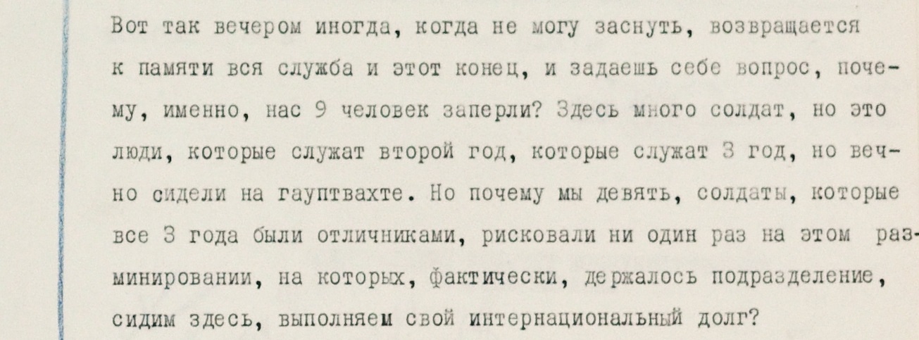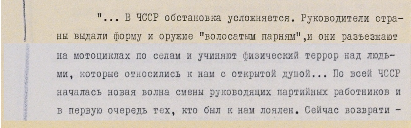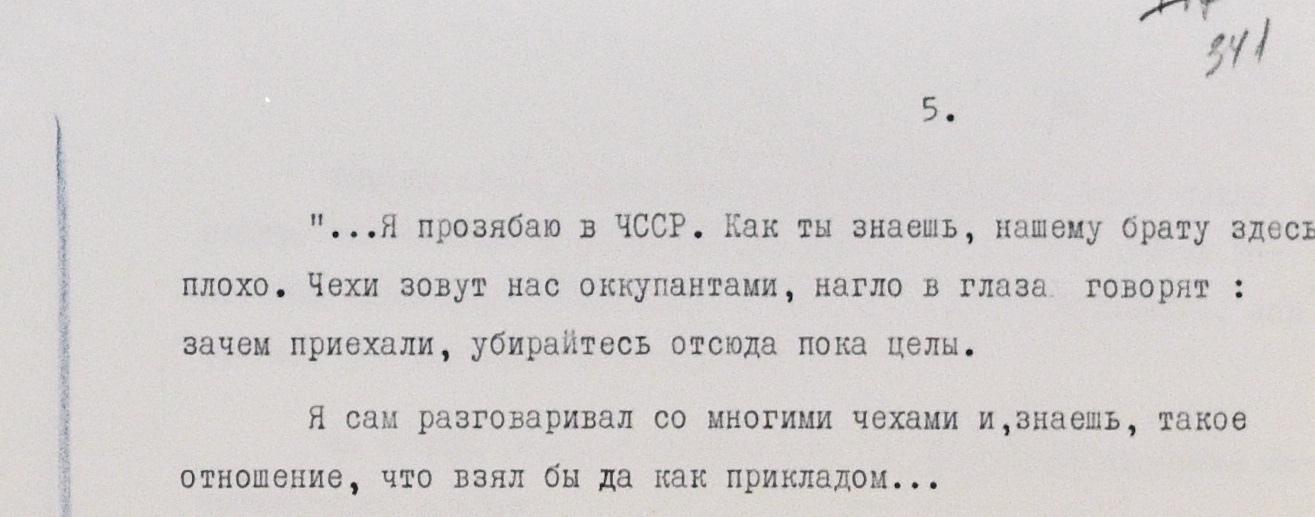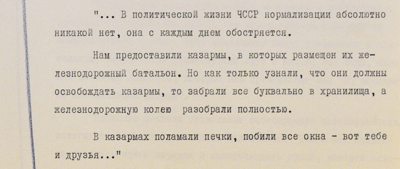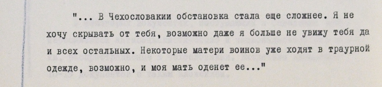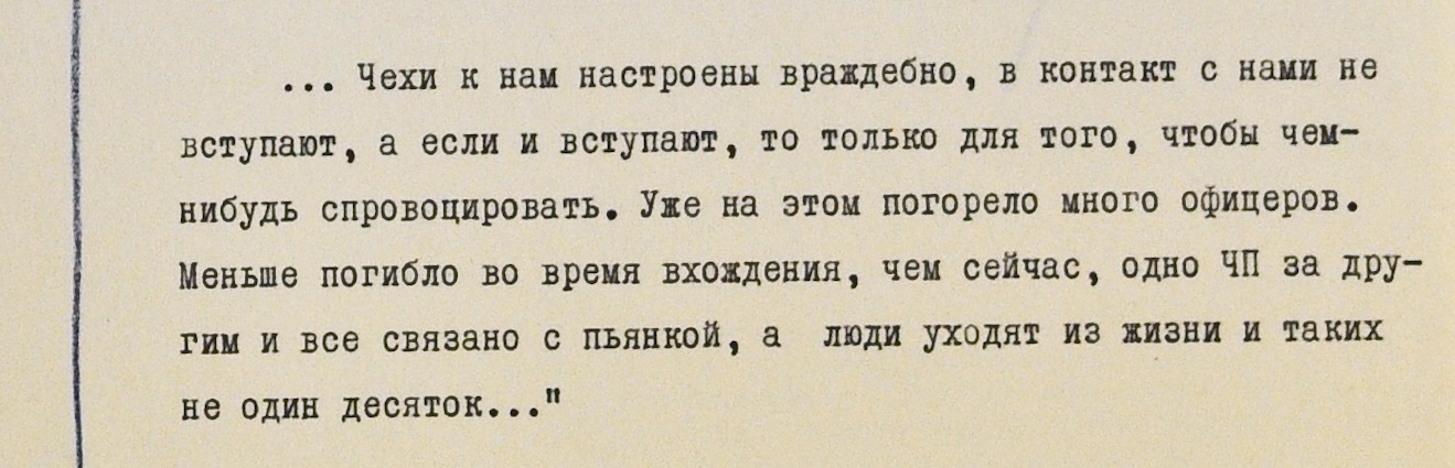 В одном письме упоминаются проблемы с психикой у находящихся в ЧССР военнослужащих: “Здесь уже некоторые сверхсрочники начинают в полном смысле слова сходить с ума, уже двоих отправили”.