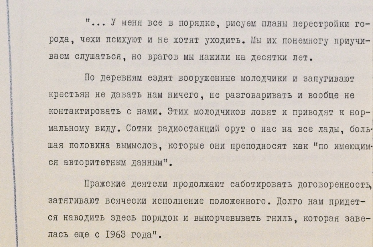 Авторы писем признают: абсолютное большинство чехов и словаков – на стороне “контры”. Сомнений в том, что ввод войск против воли большинства жителей страны нужен и оправдан, никто в переписке не высказывает.