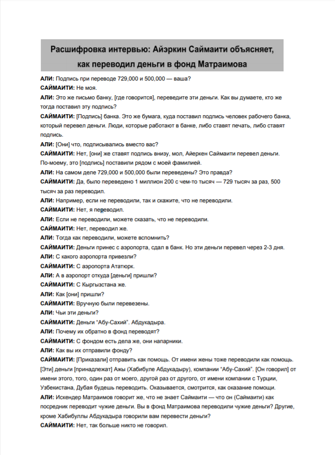 Но оставалась одна загвоздка. Расследование «Азаттыка» использовало предоставленные Саймаити документы, чтобы поднять вопрос о происхождении и целях выплат 2,4 миллиона долларов, которые были переведены в 2016 и 2017 годах.