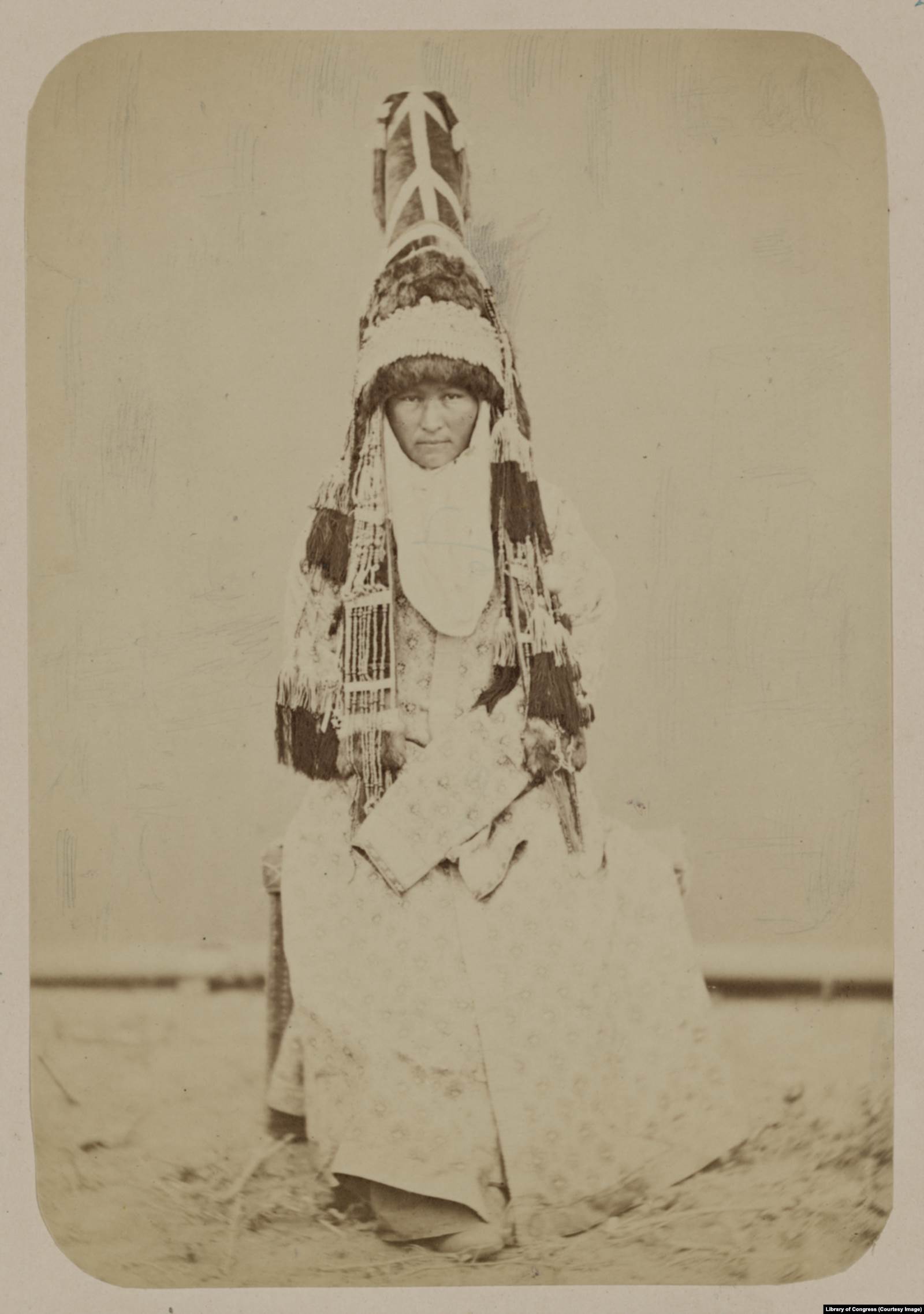 Сразу после замужества женщины надевали сэукеле (саукеле) – шапку в форме конуса, высотой около 70 сантиметров. Головной убор расшивали золотыми монетами, вверху цепляли пучок из перьев филина, а края отделывали мехом.
