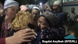Еще одна женщина, Каршыга Деметова, вытирая слезы, говорит, что ей "все еще не верится, что она наконец-то приехала".