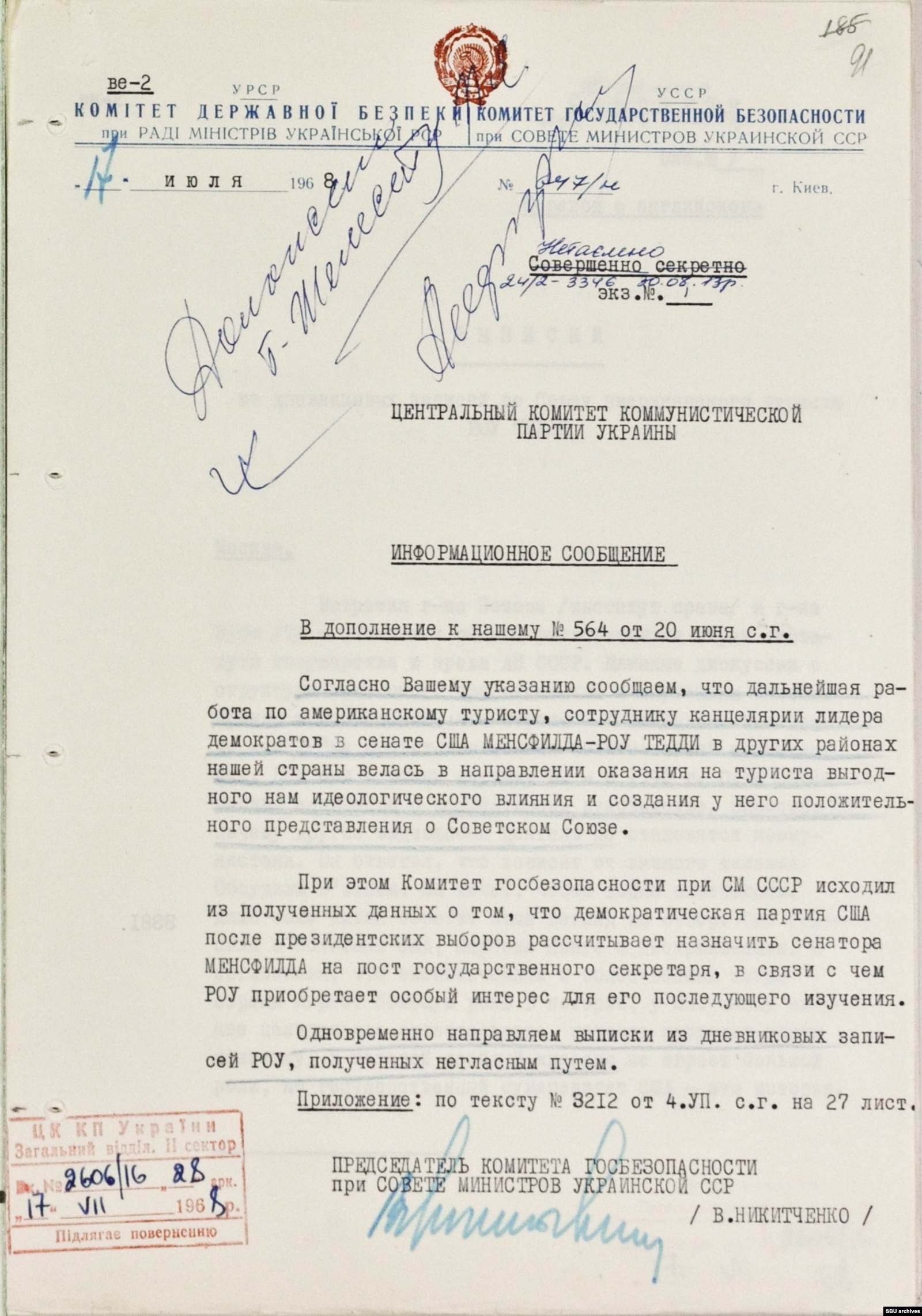 "...Демократическая партия США после президентских выборов рассчитывает назначить сенатора Менсфилда на пост государственного секретаря, в связи с чем Роу приобретает особый интерес для его последующего изучения”, – сообщал КГБ в другом сообщении для ЦК КПУ еще через месяц, в июле.