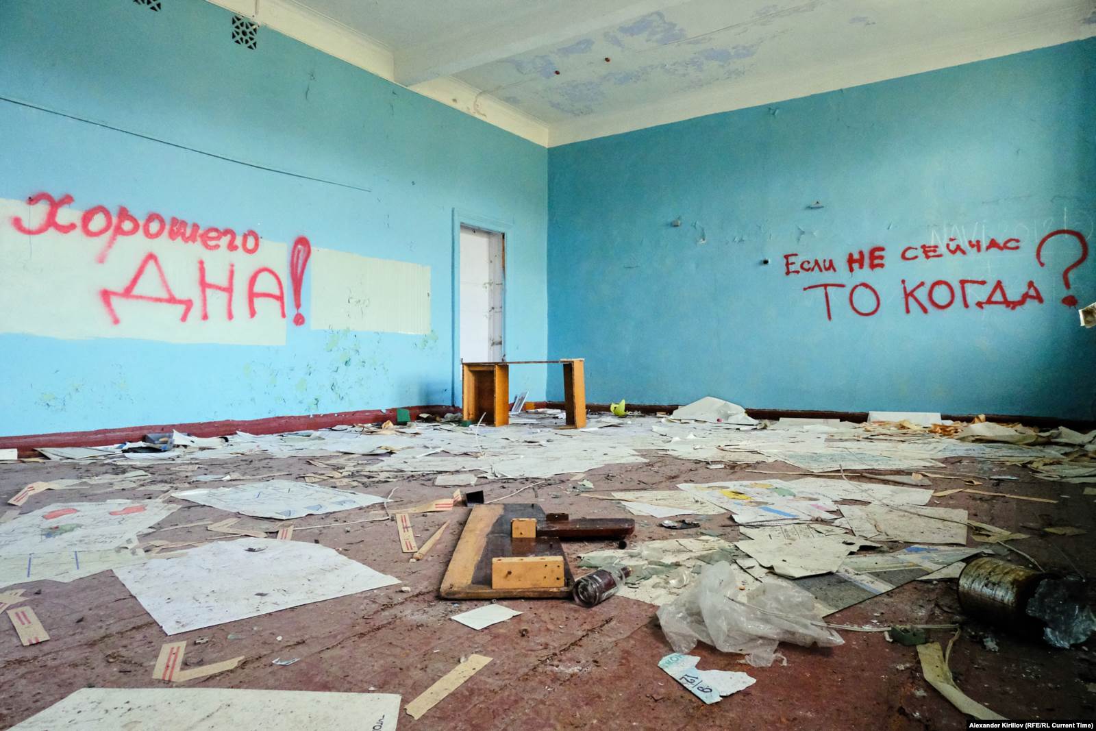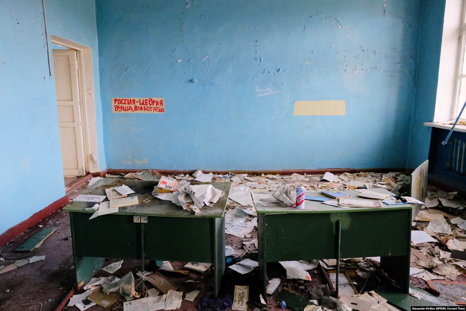 Этот лозунг написан на стене в одном из классов бывшей териберской школы. Ее закрыли и забросили вместе с классным оборудованием и целой библиотекой. Книги растаскали туристы и местные. Жителям также приглянулся пол в спортзале, который разобрали на строительство сараев. Но кирпичное трехэтажное здание оказалось достаточно крепким, чтобы не развалиться за несколько лет без присмотра. Местные говорят, что школа уже выкуплена кем-то, но до сих пор никак не используется и будет ли — неизвестно.